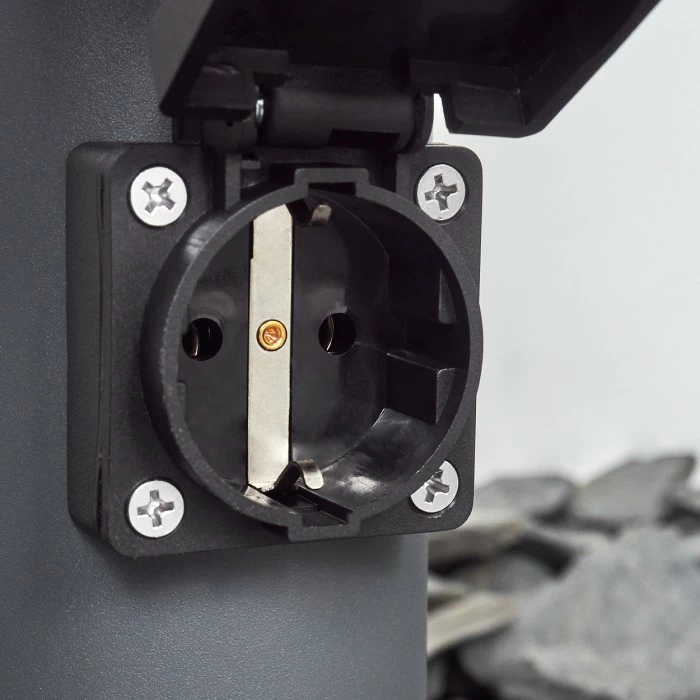 In diese Leuchte ist eine Steckdose mit Schutzabdeckung integriert.